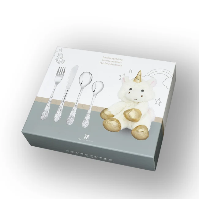 Barnebestikk i stål i fire deler. Består av kniv, skje, gaffel og babyskje.
