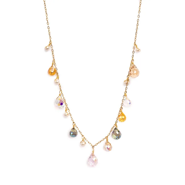 Delikate glassdråper i en nydelig fargekombinasjon, nedtonet og samtidig glamorøs. Like fin til hverdagsantrekket som festkjolen, alene, eller lag på lag med andre kjeder i kolleksjonen.