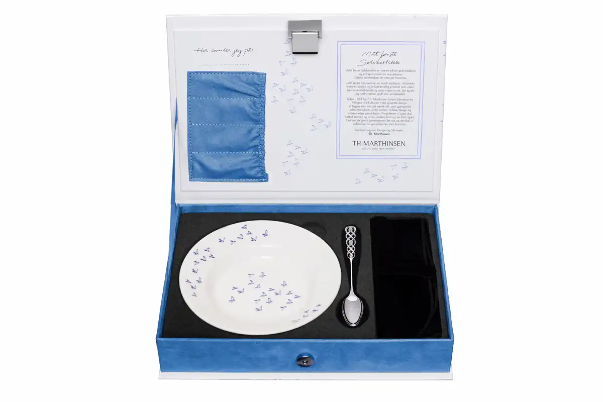 «Min dåpsskje» gravert i skjebladet på barneskjeen. Det er mulig å få mer gravering på produktet.