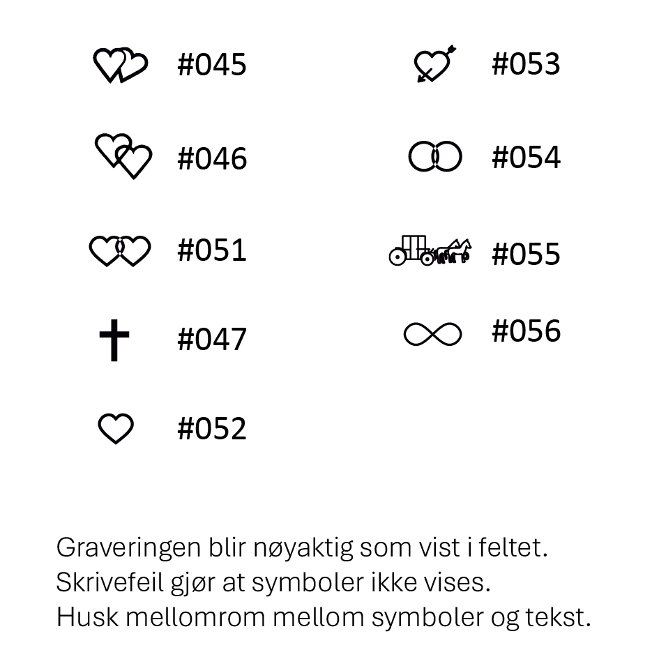 Dersom du ikke ønsker gravering forlater du feltet tomt. Graverte produkt kan ikke byttes.