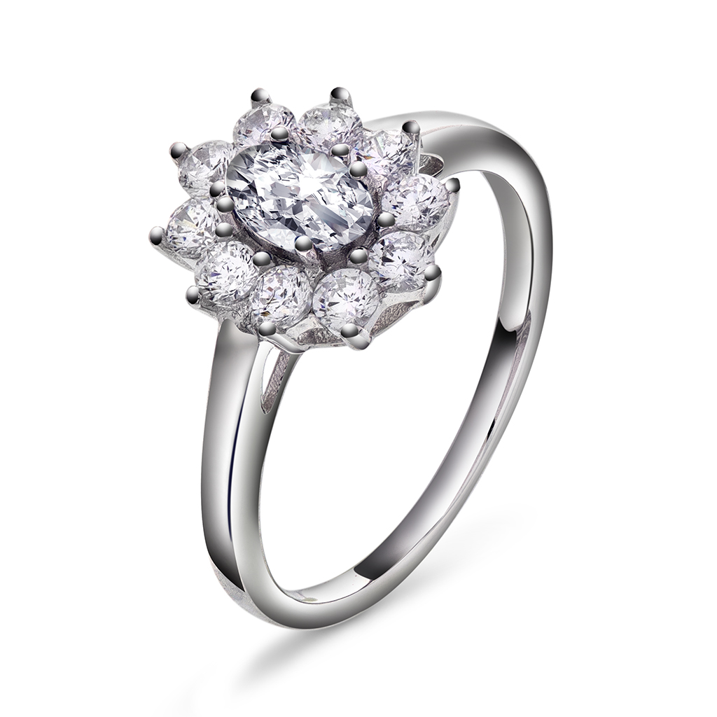 En tidløs og sofistikert ring i 925 rhodinert sølv med hvit sentersten, omkranset av glitrende hvit zirkonia.