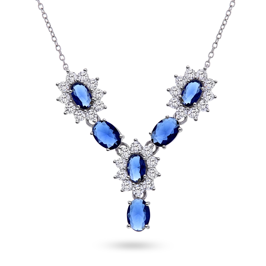 Et tidløst og sofistikert smykke i 925 rhodinert sølv med blå sentersten, omkranset av glitrende hvite stener.